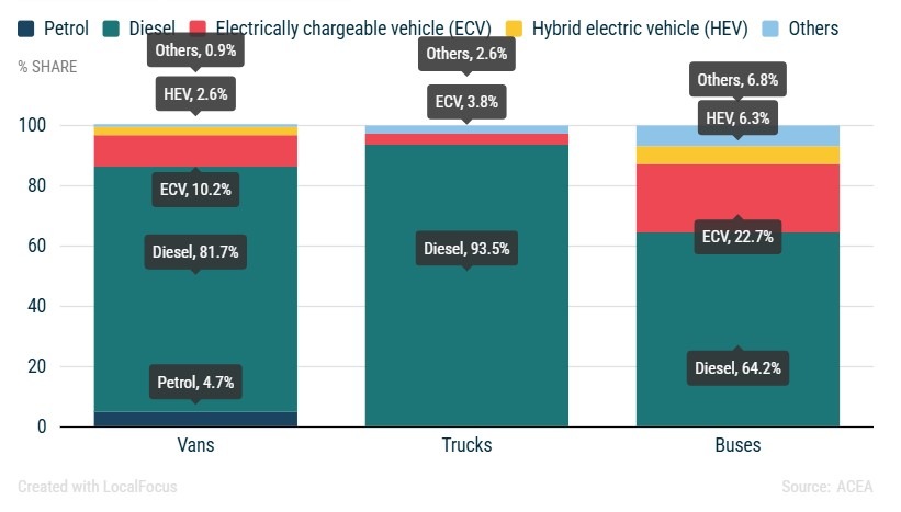 Diesel si během prvních devíti měsíců roku 2025 udržel vedoucí pozici na trhu nákladních automobilů v EU a představoval 93,5 % nových registrací, a to i přes pokles objemu o 11,5 %. Elektricky dobíjecí nákladní automobily nyní zaujímají 3,8 % trhu, což je nárůst oproti 2,1 % v loňském roce. Hlavními hnacími silami tohoto vývoje byly Nizozemsko (+192,3 %), Německo (+32,9 %) a Francie (+27,2 %), které společně představují dvě třetiny trhu EU s elektricky dobíjecími nákladními vozidly.