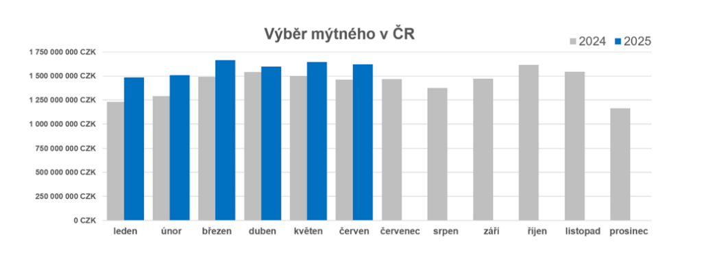 V červenci uhradili dopravci za jízdu po zpoplatněných dálnicích a silnicích I. třídy celkem 1,67 miliardy korun, meziročně o 13,7 % více. Ke dvoucifernému růstu přispěl nejen jeden pracovní den navíc oproti červenci 2024, ale také rozšiřující se dálniční síť v České republice. Díky struktuře a výši mýtných sazeb atakuje poplatek za užití dálnic dlouhodobě hranici 90 procent z celkového výběru mýtného.
