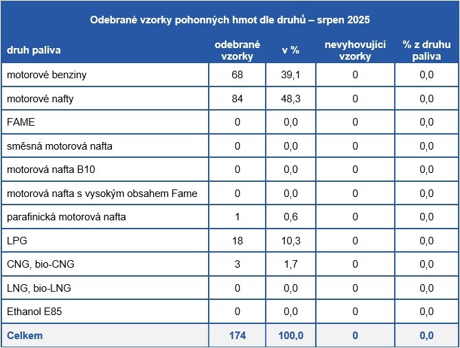 Česká obchodní inspekce monitorovala kvalitu pohonných hmot v měsíci srpnu 2025. Na čerpacích stanicích v ČR odebrala celkem 174 vzorků, z toho 68 vzorků motorových benzinů, 84 vzorků motorových naft, 1 vzorek parafinické motorové nafty, 18 vzorků LPG a 3 vzorky CNG. Všechny vzorky vyhověly stanoveným jakostním požadavkům.