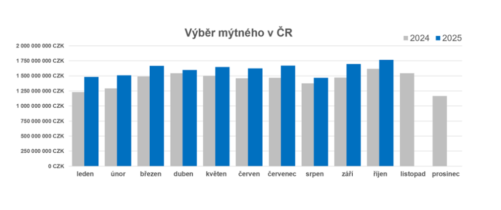 Výběr mýtného od vozidel s hmotností nad 3,5 tuny dosáhl v říjnu 1,768 miliardy korun. Meziročně to znamená růst o 11,6 %. Počet zpracovaných mýtných transakcí společností CzechToll v desátém měsíci meziročně nepatrně vzrostl na necelých 110 milionů.