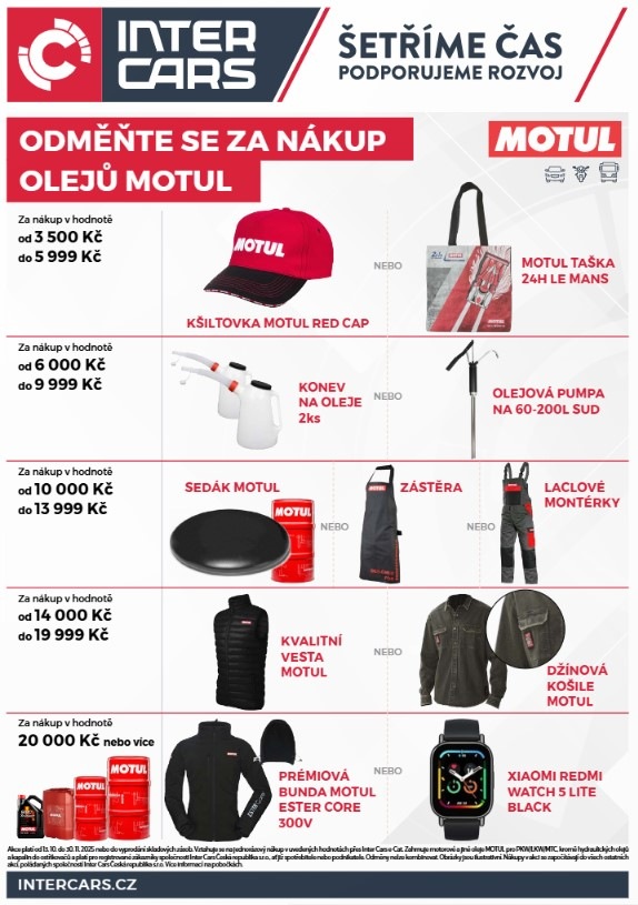 Chcete si k nákupu olejů MOTUL připsat dárky? Nakupujte u firmy Inter Cars. Akce platí od 13. 10. do 30. 11. 2025 (nebo do vyprodání zásob).
