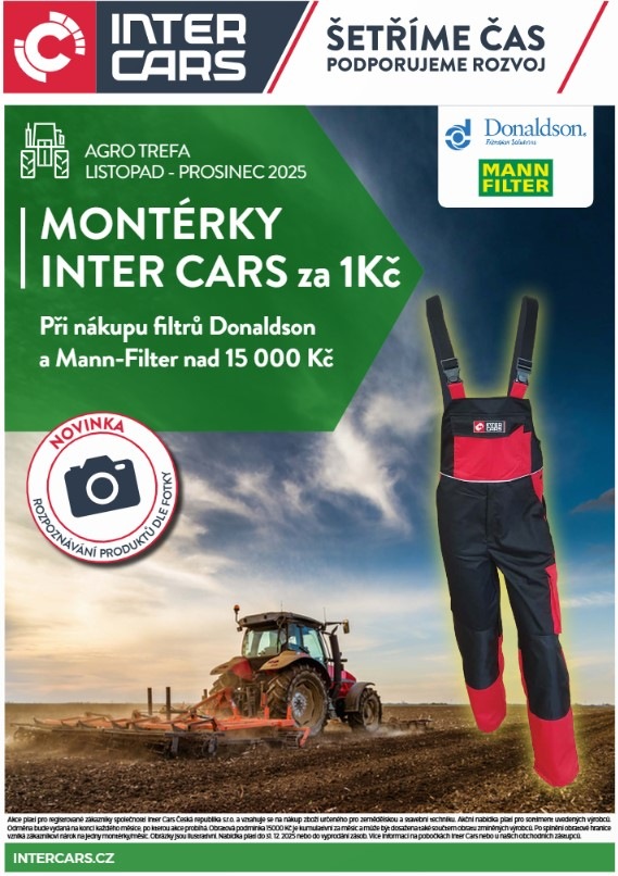 Firma Inter Cars připravila agrotrefu, kdy za nákup filtrů Donaldson a Mann-Filter získáte za 1 Kč monterky Inter Cars. Akce platí v měsících listopad a prosinec 2025.
